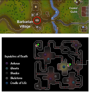 Once you've got everything, it's time to head to Barbarian Village. More specifically, you'll need to go down to the Stronghold of Security, using the hole as shown on the map. Navigating through the mazes of each level, you'll find yourself on the bottom floor, the “Sepulchre of Death” floor. And as shown...